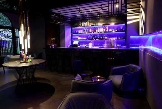 美食酒廊Opposite開在一幢修葺一新的兩層老洋房里,后面是一排高大上的豪華聯(lián)體公寓。它集各種截然不同的元素于一體:古典與現(xiàn)代、光明與黑暗、美食與酒飲。樓上的餐廳燈光閃耀,一樓的酒吧光線昏暗,籠罩著一種深沉的氣氛,這是在“向1930年代地下酒吧的低調(diào)風格致敬”。