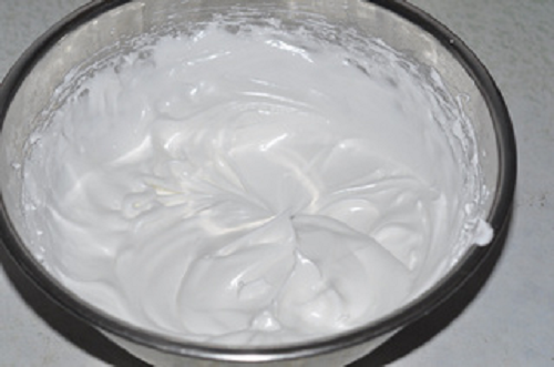 將蛋清打至硬性發泡,中間分三次加糖共90克,蛋液表面出現魚眼泡時加一次,蛋白微微拉出尖角豎立起來時加一次,拉出挺立尖角時加最后一次。