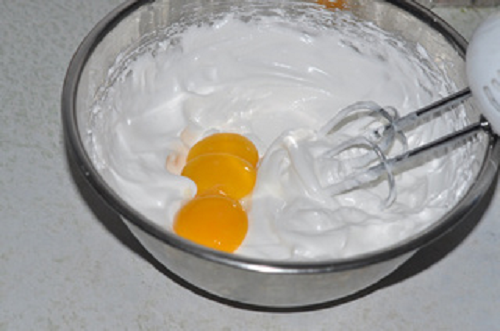 將蛋黃加入蛋白霜中。