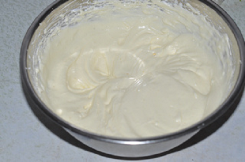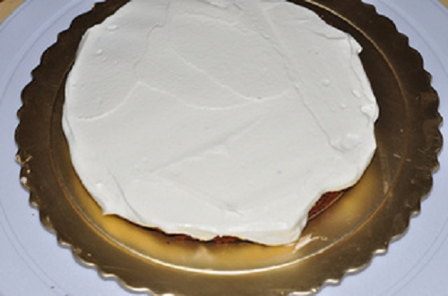 將安佳淡奶油加糖打發后取適量抹在一片蛋糕上。