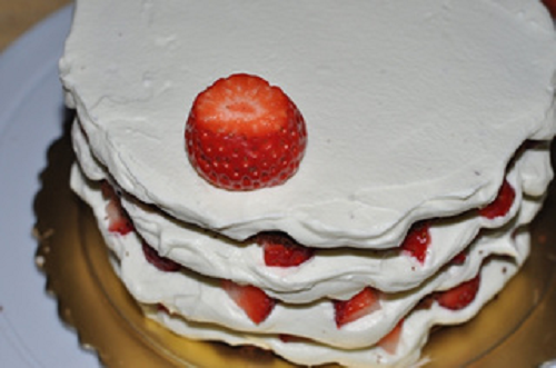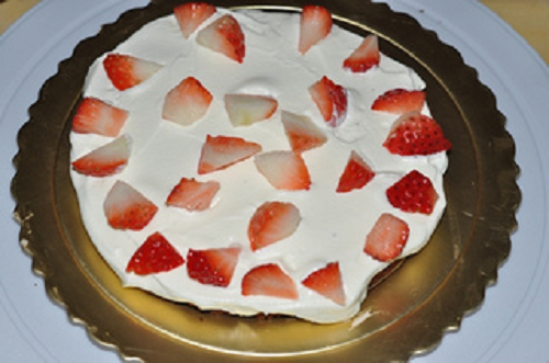 新鮮草莓切小塊,撒在奶油上面即可