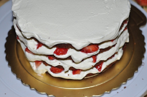 按上述方法將所有蛋糕片疊在一起,表面抹上奶油。