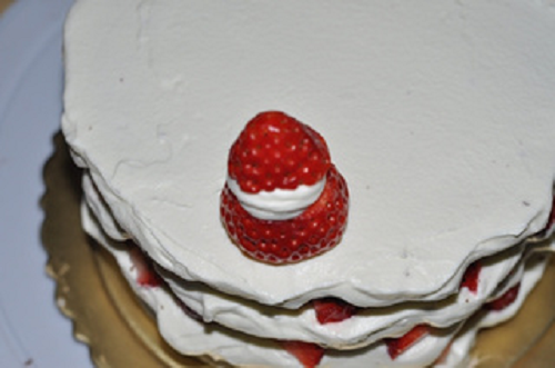 取一個草莓從頂部切去三分之一,放在蛋糕表面。