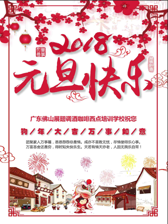 佛山展翅調酒咖啡西點培訓學校在此感謝這一年來全體學員們對我校的支持與肯定,感謝全體老師和同事們的辛苦付出,2017感謝有你,2018讓我們攜手同行。祝大家元旦快樂,新的一年萬事如意,心想事成!