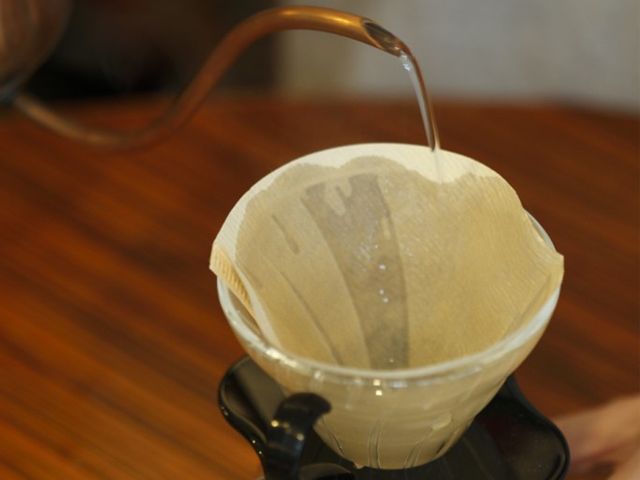 第一步:濾紙、濾杯、分享壺依次放在電子稱上,從濾杯中注入熱水,用熱水溫杯、溫壺,并清洗濾紙,并使濾紙貼合濾杯 。